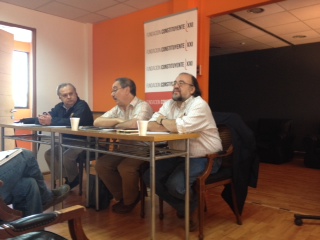 Esteban Silva, sociólogo, Sergio Grez, historiador, y el economista Patricio Guzmán, en representación de las instituciones organizadoras de la Escuela de Monitores y Monitores para a una Asamblea Constituyente, informaron sobre los contenidos que se desarrollarán en la Escuela y presentaron a los profesores y dirigentes sociales y académicos que impartirán los cursos.